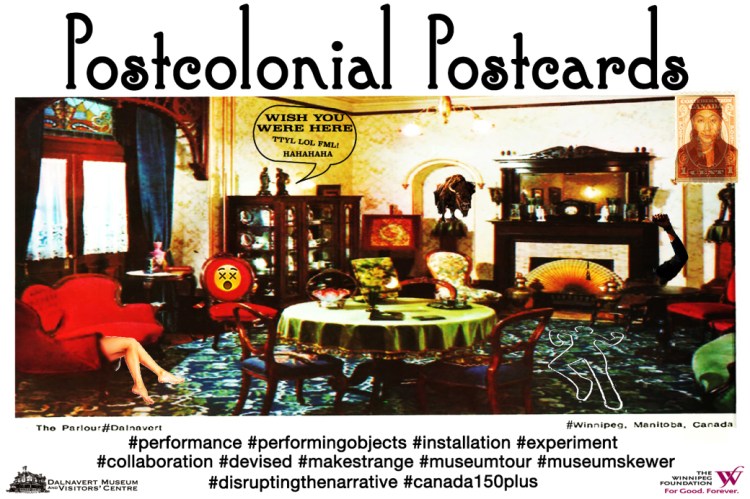 Postcolonial Postcards was devised within a Canadian-Victorian museum setting wherein the housed objects already rest ripe with meaning. The artists confronted the caged artifacts through a variety of improvisation techniques (facilitated by Mia) combined with a mash-up of their own identity (and their own/other objects) as a basis for the generation of material.