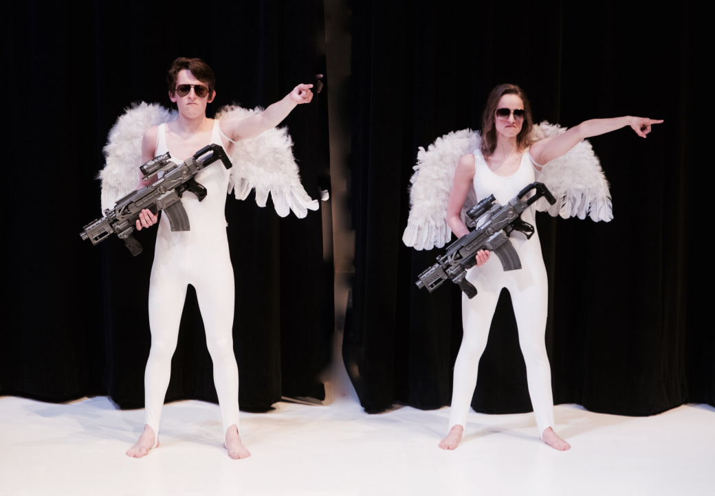 There is no one method of devising theatre: the process is unique to the backgrounds, interests, and desires of those involved. Devising usually allows for a high level of agency for the actor-creators to contribute to the work. For our production, students were asked to bring in their own research interests related to the story of Adam and Eve. Podcasts, songs, articles, images, cartoons, poetry and more came into the room. As director, I provided a map that outlined a possible sequence of events to work within and sculpted space for the multiple perspectives of the research to be held. The map also contained performance concepts and approaches to story-telling that resulted in a variety of representations: video-montage, sound-collage, illustrative physical theatre, podcast-improvisation, and text translations of excerpts from “The Creation” into other languages (Yoruba and Romanian). Also, the story of Eve and her role in the fall of humanity was questioned and reconsidered in our telling.